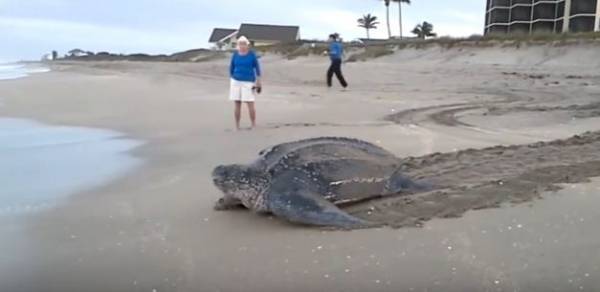 شاهد بالفيديو.. أكبر سلحفاة في العالم تفاجئ السياح