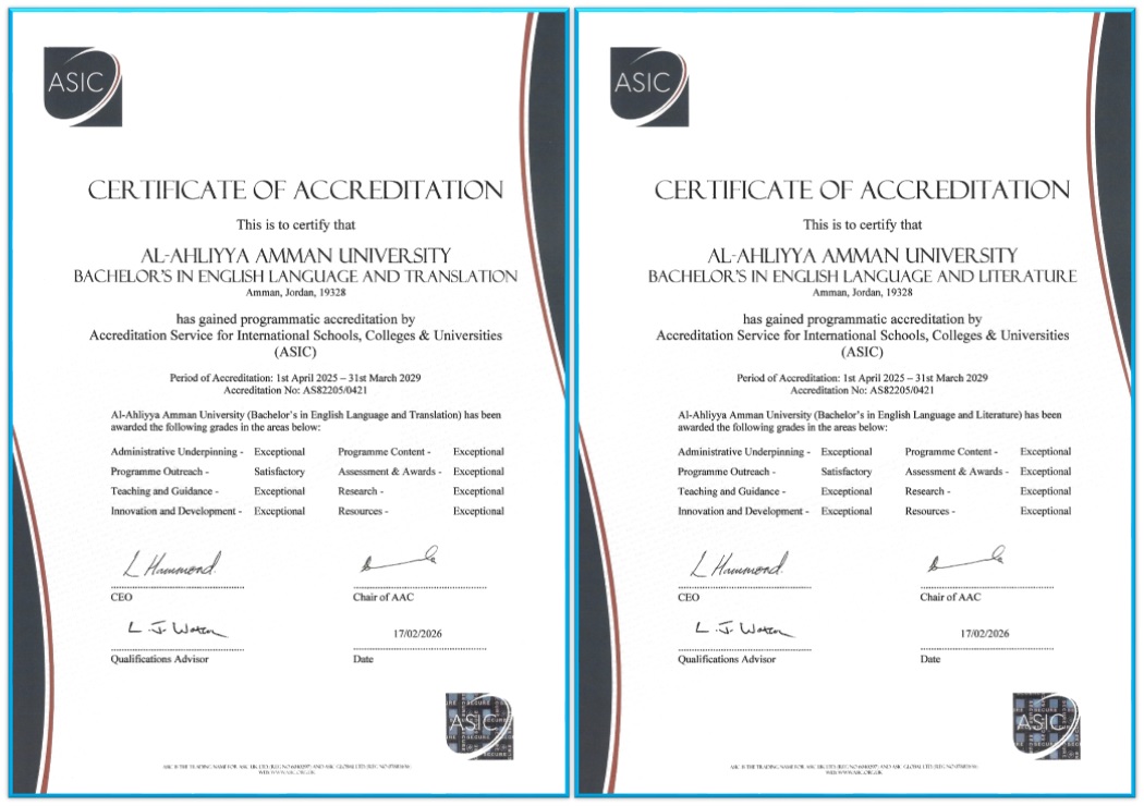 عمان الاهلية تحوز على الاعتماد البريطاني ASIC ببرنامجي اللغة الانجليزية "الآداب والترجمة " وفق أعلى مستوى