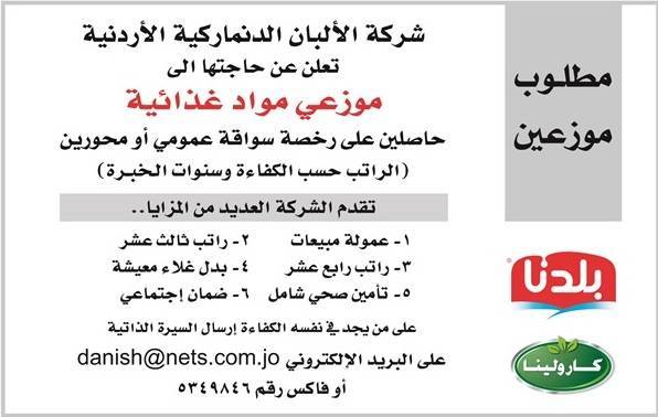 شركة الالبان الدنماركية الاردنية تعلن عن حاجتها الى موزعي مواد غذائية