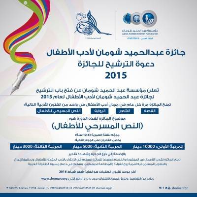 اعلان فتح الترشيح لجائزة عبد الحميد شومان لأدب الأطفال 2015 حول "النص المسرحي للأطفال"