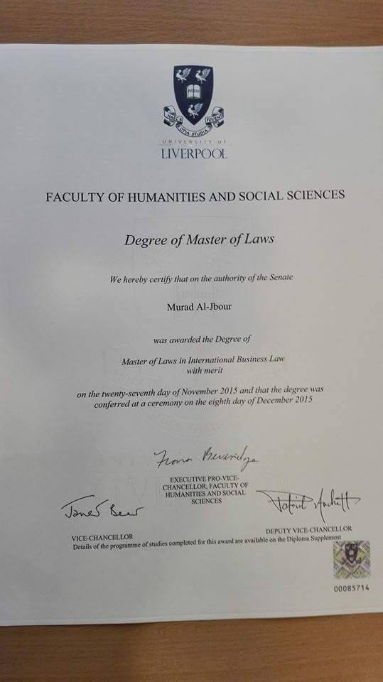 مراد المجالي يحصل على درجة الماجستير في القانوني الدولي من بريطانيا