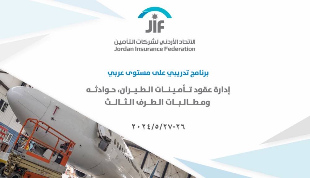 سعياً من الاتحاد الأردني لشركات التأمين بالاستعانة بالخبراء المحليين والعرب لتدريب الكوادر العاملة في سوق التأمين الأردني والمؤسسات الاقتصادية التي تتقاطع اعمالها مع قطاع التامين، يستضيف الاتحاد الاردني لشركات التأمين خبير التأمين السيد مازن الغلايبي والذي سيحاضر في البرنامج التدريبي الرابع الذي يعقده الاتحاد على مستوى عربي بعنوان " إدارة عقود تأمينات الطيران، حوادثه ومطالبات الطرف الثالث" للفترة 26-27/5/2024 وبواقع (12) ساعة تدريبية على مدار يومين تدريبيين.