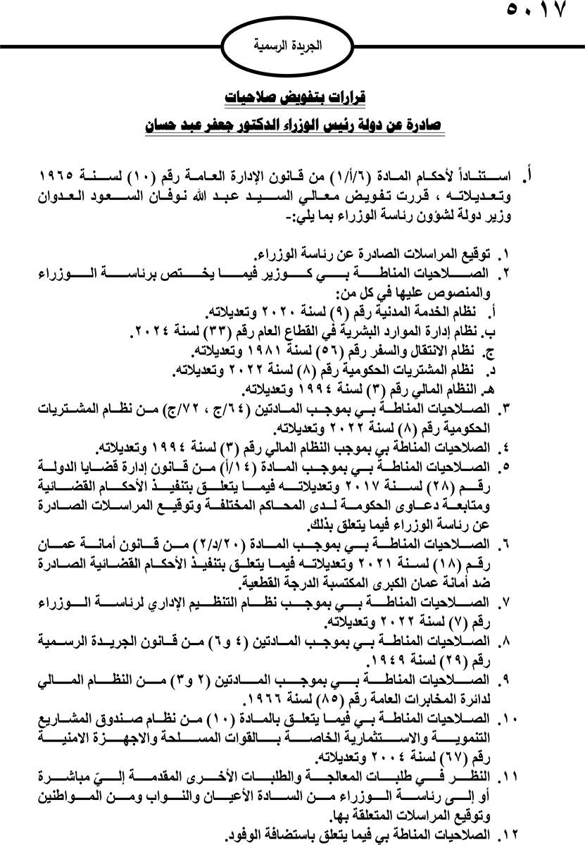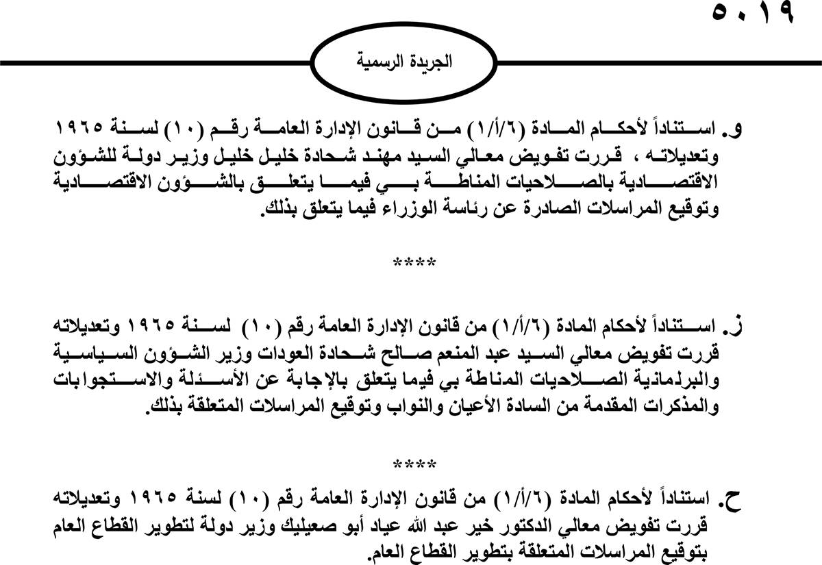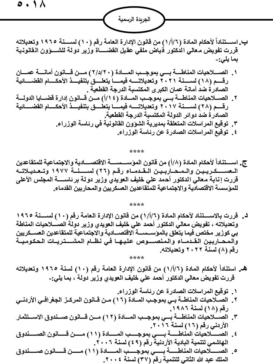 وشمل القرار تفويض صلاحيات للوزراء ، عبدالله العدوان (وزير دولة لشؤون رئاسة الوزراء) وفياض القضاة (وزير دولة للشؤون القانونية) وأحمد العويدي (وزير دولة) و- مهند شحادة (الشؤون الاقتصادية) و- عبد المنعم العودات (الشؤون السياسية والبرلمانية) وخير أبو صعيليك (تطوير القطاع العام.