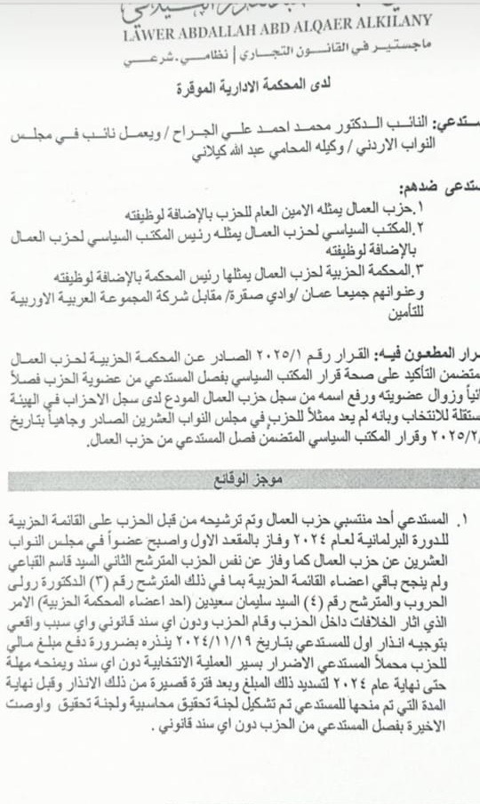 في اول سابقة حزبية كشف احد المحامين بان النائب الحالي الدكتور محمد الجراح قد تقدم بالطعن في قرار رقم ١/٢٠٢٥ والصادر عن المحكمة الحزبية في حزب العمل للمحكمة الادارية والمتضمن فصله من عضوية حزب العمال فصلا نهائيا وزوال عضويته ورفع اسمه من سجل حزب العمال المودع لدى سجل الاحزاب في الهيئة المستقلة للانتخاب وانه لم يعد ممثلا للحزب في مجلس النواب الحالي والصادر وجاهيا بتاريخ ٥/٢ /٢٠٢٥.