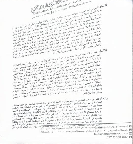 ٢٠٢٤/١٢/٩ علاوة على قيامه بتقديم اعتراض في نفس اليوم حول عقوبة الانذار الا انه تم احالة الاعتراض للمحكمة الحزبية للطعن في قرار الفصل فقط ولم يتم ارفاق استدعاء الاعتراض على الانذار بدون اي سند قانوني وقررت المحكمة الحزبية قبول الطعن شكلا بتقيمه ضمن المدة وتم السير بالدعوة الا ان اجراءات المحاكمة الحزبية لم تسمح له سماع كافة البينات او مناقشته لا بل وتم عدم اجازة طلبه بتقديم اي بينه تدحض تلك البينات علاوة على ان اجراءات محاكمة المستدعي فيها مخالة للدستور والنظام الداخلي لمجلس النواب.