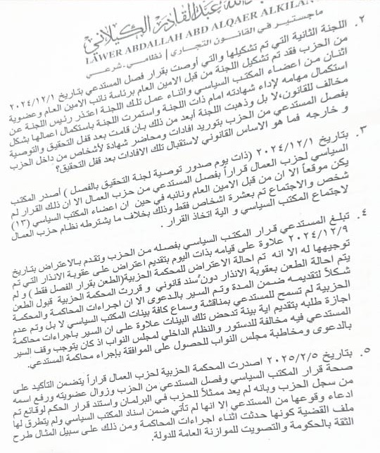 وبتاريخ ٢٠٢٥/٢/٥ اصدرت المحكمة الحزبية لحزب العمال قرارا يتضمن التاكيد على صحة قرار المكتب السياسي وفصل المستدعي من الحزب وزوال عضويته ولم يعد ممثلا للحزب في البرلمان مستندا قرار الحكم لوقائع تم ادعاء وقوعها للمستدعي الا انها لم تاتي ضمن اسناد المكتب السياسي ولم يتطرق لها ملف القضية كونها حدثت اثناء اجراءات المحاكمه وعلى سبيل المثال طرح الثقة بالحكومة والتصويت للموازنه العامة.