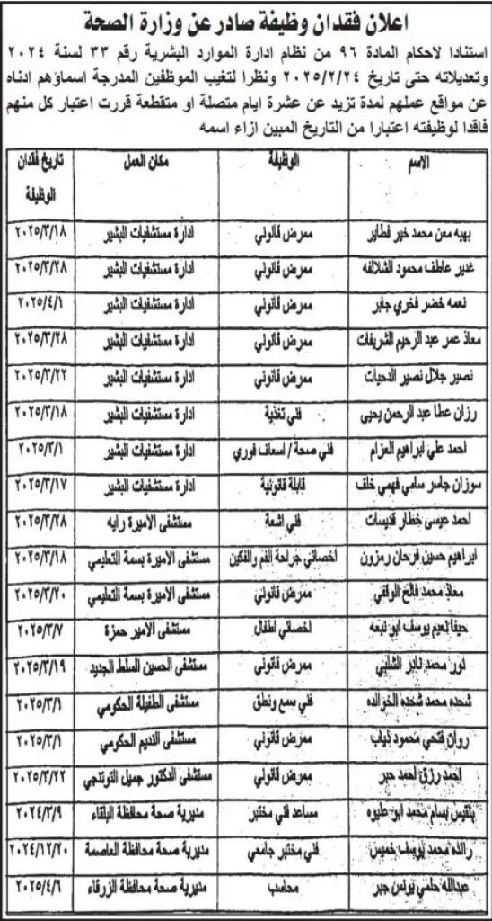 أعلنت وزارة الصحة، اليوم الاثنين، عن فقدان موظفين لوظائفهم، وذلك نظرا لتغيبهم عن مواقع عملهم لمدة تزيد عن 10 أيام متصلة أو متقطعة.