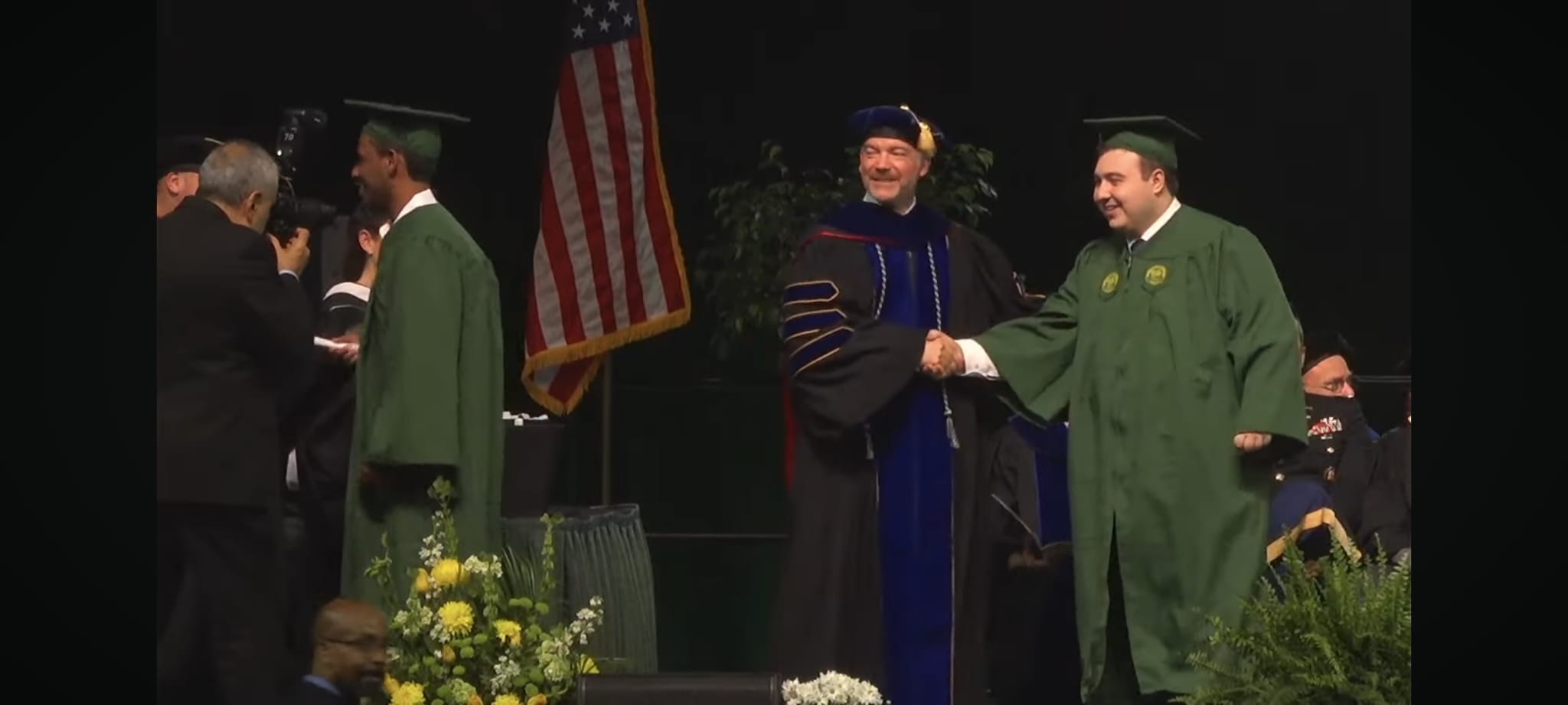 يدي الطالب الخريج المتفوق والمبدع والمهذب "منيب باسم ظبيان" كانت يده تستلم ثمرة تعبه وسهره بشهادة جامعية لا بل شهادتان جامعيتان في تخصصين رائدين الاول Computational and Data Sciences والاخر في مجال Business Analytics فيما كانت اليد الاخرى تلوح وهي تحمل ثمرة هذا النجاح لوالده الذي صفق كثراً وعيناه تزرع سلماً من الياسمين والمجد والغار على هذه الشهادة بيد ابنه الذي ابدع وتميز وحقق حلمه وحلم والديه ليعود اردنياً يرفع رأسه بفخار وعينه ترسم امل وطموح لامست القلب واضاءت درب المسير الذي سيرسم مستقبلاً مشرقاً.