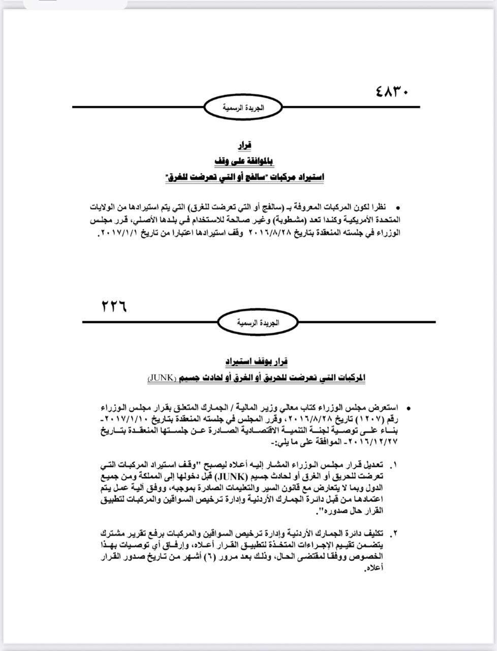 بدورها، نفت دائرة الجمارك الأردنية فيما يخص هذه القضية، مؤكدة أن الدائرة تعمل ضمن الأنظمة والقوانين ملتزمة بقرارات مجلس الوزراء ولن تتعدى عليها، ويمنع منعاً باتاً أن تتجمرك مركبات يزيد عمرها عن 5 أعوام.