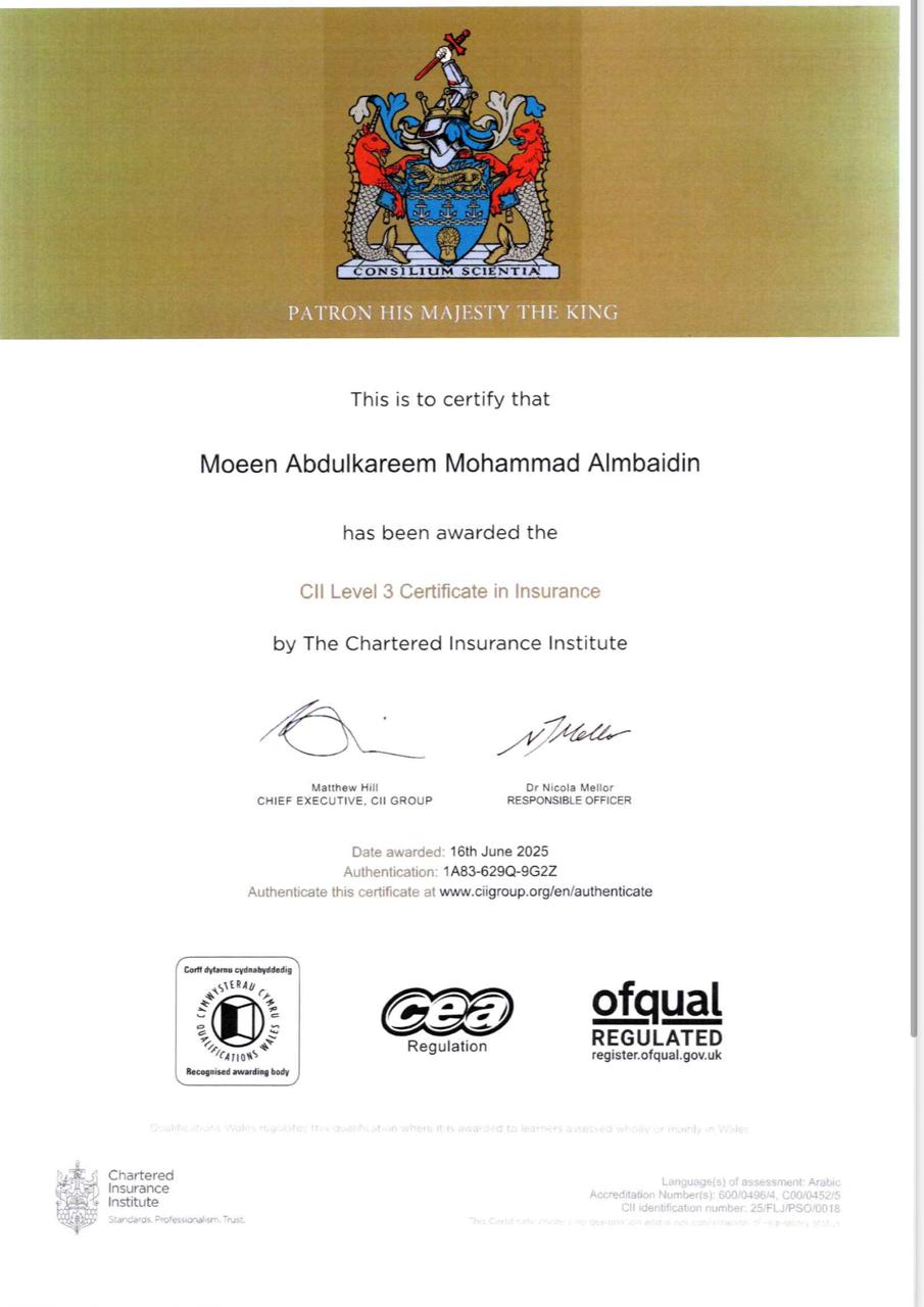 تتقدم أسرة الاتحاد الاردني لشركات التأمين بالتهنئة للزميل معين المبيضين والذي يعمل مسوي حوادث في دائرة الحوادث والتعويضات في الاتحاد الأردني لشركات التأمين، بمناسبة حصوله على الشهادة المهنية في التأمين بتاريخ 16/6/2025 (شهادة التأمين Certificate in Insurance من معهد التأمين القانوني في لندن Chartered Insurance Institute))) وذلك بعد اجتياز امتحانات المواد الثلاثة المطلوبة للشهادة وهي مادة التأمينات العامة ومادة الاكتتاب في التأمين ومادة كيفية التعامل مع مطالبات التأمين.