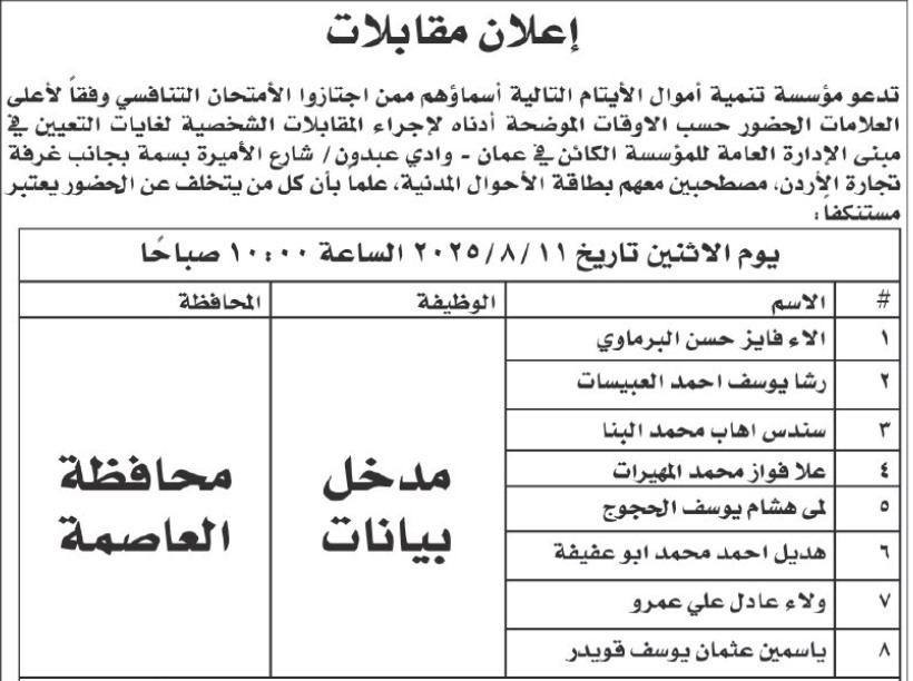 كما دعت مؤسسة تنمية أموال الأيتام التالية أسماؤهم لإجراء المقابلة الشخصية.