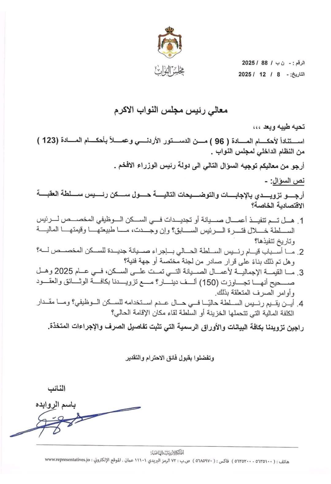 وتضمّن السؤال أيضًا استفسارًا حول مكان إقامة رئيس السلطة الحالي في حال عدم استخدامه للسكن الوظيفي، وما تتحمله الخزينة أو سلطة العقبة من نفقات مقابل مكان الإقامة الحالي.