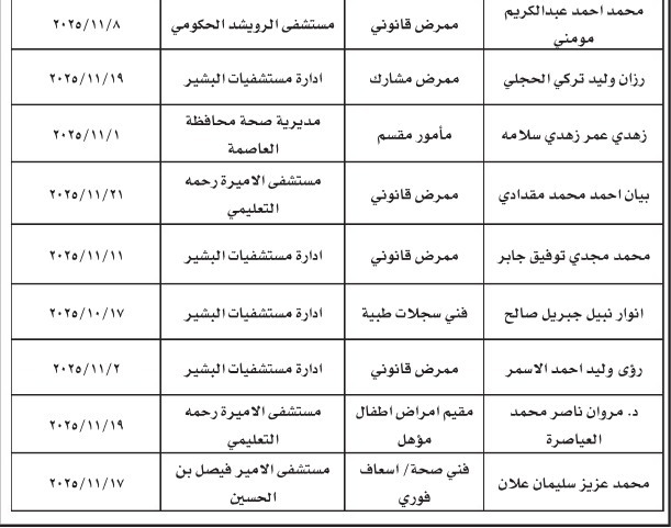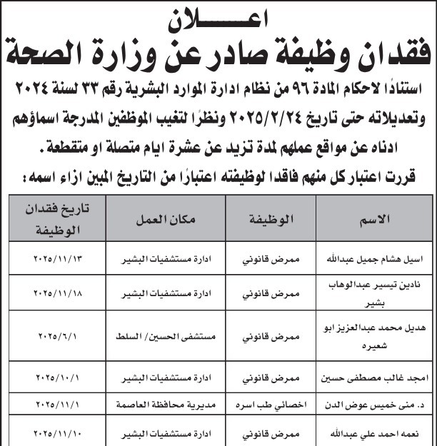 قررت وزارة الصحة اعتبار الموظفين المدرجة أسماؤهم أدناه فاقدين لوظائفهم، وذلك بسبب تغيبهم عن مواقع عملهم لمدة تزيد على عشرة أيام متواصلة أو متقطعة، استنادًا إلى أحكام المادة (96) من نظام إدارة الموارد البشرية رقم (33) لسنة 2024 وتعديلاته، وذلك حتى تاريخ 24/2/2025.