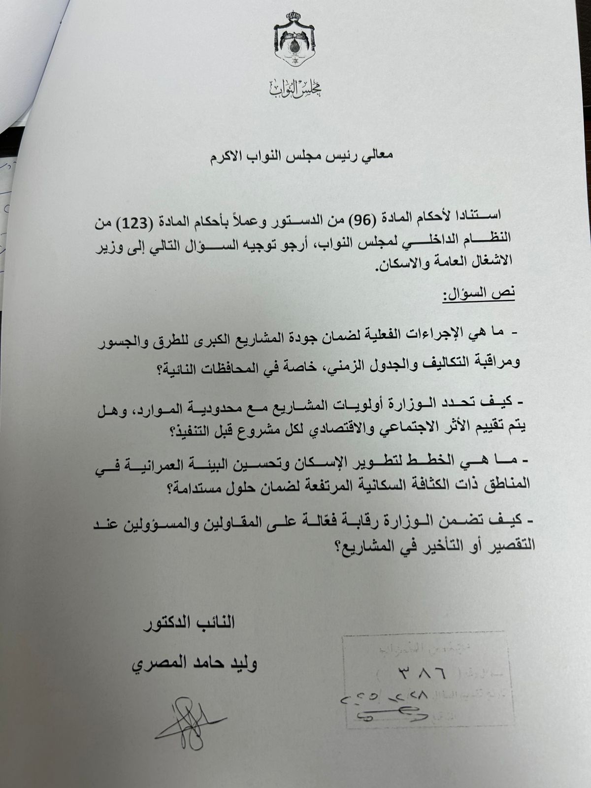 وجّه النائب الدكتور وليد المصري سؤالاً نيابياً إلى وزير الأشغال العامة والإسكان، المهندس ماهر أبو السمن عبر رئاسة المجلس طالب فيه الوزير بتوضيح الإجراءات الفعلية لضمان جودة المشاريع الكبرى للطرق والجسور وطلب النائب في سؤاله معرفة إجراءات مراقبة التكاليف والجدول الزمني خاصة في المحافظات النائية،