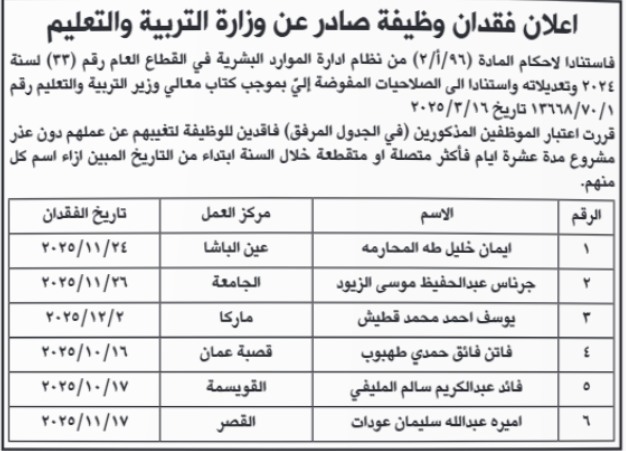 أصدرت وزارة التربية والتعليم قرارًا، استنادًا إلى أحكام المادة (96/أ/2) من نظام الخدمة المدنية لسنة 2024، يقضي باعتبار الموظفين المذكورين في الجدول المرفق أدناه فاقدين لوظائفهم.