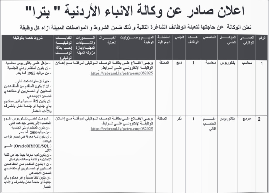 اعلنت دوائر حكومية اليوم الثلاثاء عن حاجتها لتعبئة وظائف شاغرة.