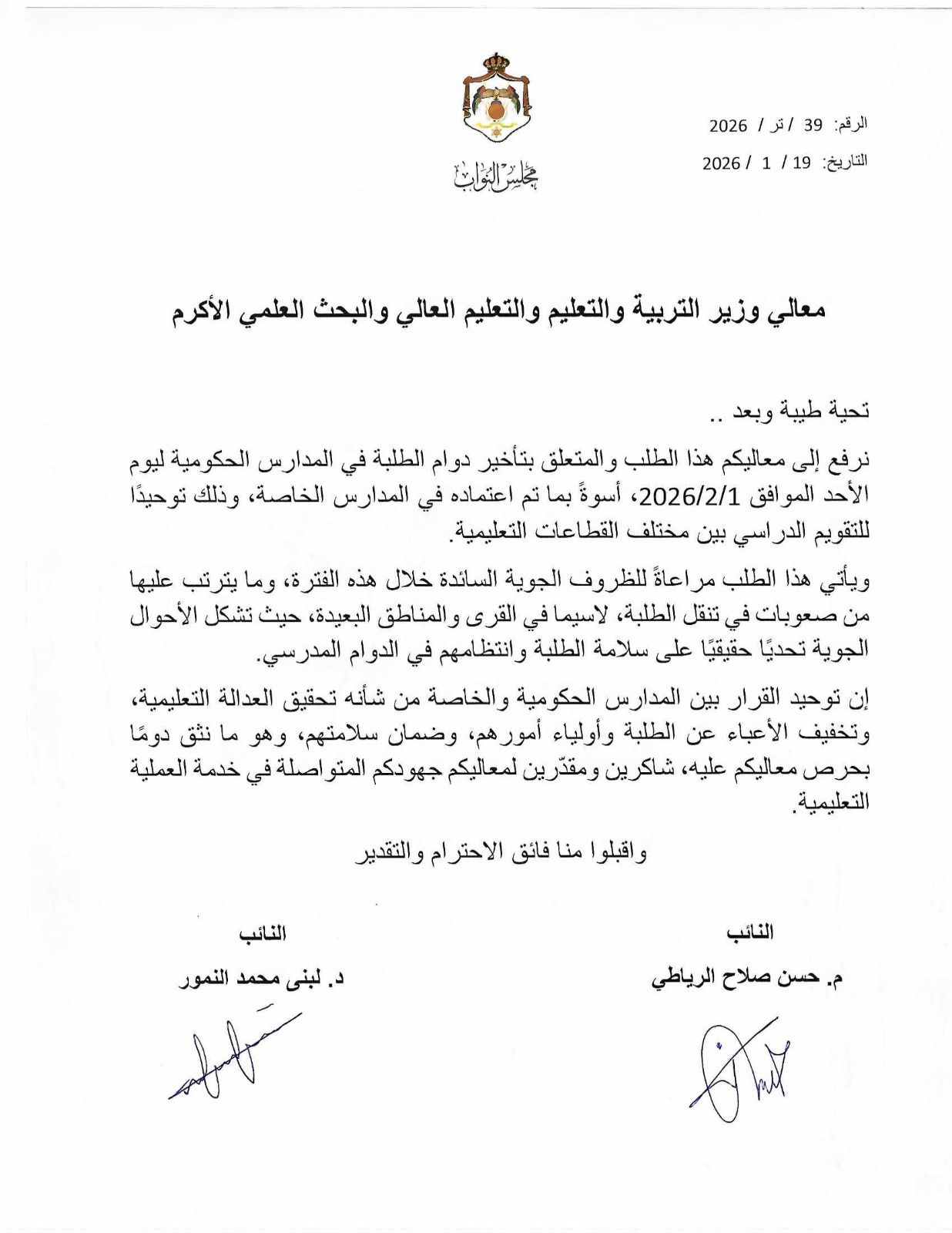 طالب النواب م. حسن صلاح الرياطي ود. لبنى محمد النمور وزير التربية والتعليم والتعليم العالي والبحث العلمي بتأخير دوام الطلبة في المدارس الحكومية ليوم الأحد الموافق 1 شباط 2026، أسوةً بما تم اعتماده في المدارس الخاصة، وذلك توحيدًا للتقويم الدراسي بين مختلف القطاعات التعليمية.