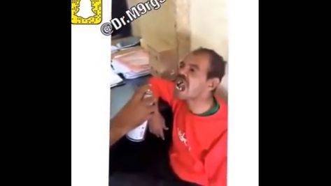 شاهد بالفيديو.. شخص يرش مادة سامة في فم شاب من ذوي الاحتياجات الخاصة بعمان