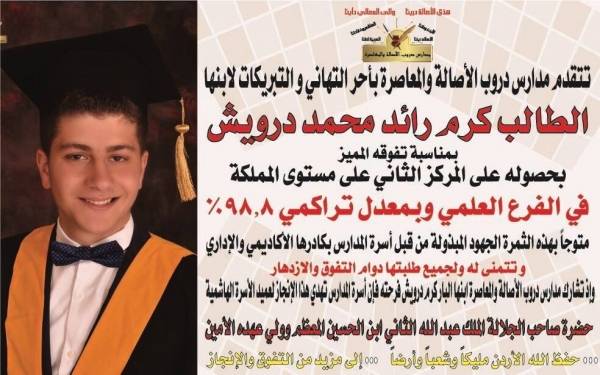 مدارس الاصالة تبارك لابنها رائد درويش لحصوله على المرتبة الثانية بالفرع العلمي