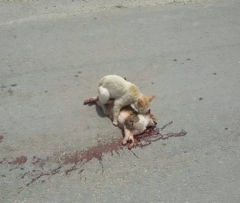 بالصور حكاية قطة .. شاهدوا مادا فعلت القطة بعد دهس صديقتها ؟!