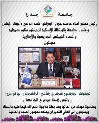 اسرة جامعة جدارة تهنىء الدكتور شكري المراشده بالشفاء وعودته سالما الى ارض الوطن