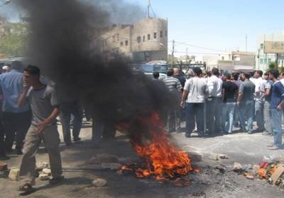 سائقو "الحافلات العمومية "بالرمثا يغلقون الشارع بالاطارات المشتعلة والحجارة ...