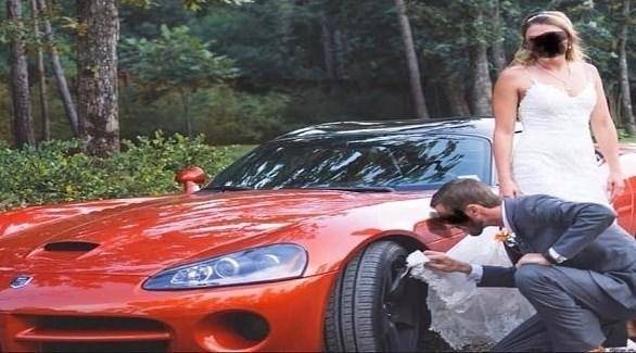 يستخدم ثوب زفاف عروسه لتنظيف عجل السيارة!