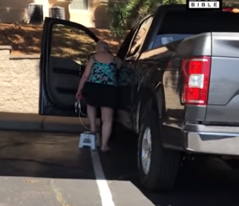 امرأة قصيرة تحل مشكلة صعودها السيارة بشكل طريف (فيديو)