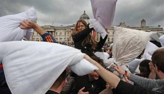 شاهد.. اندلاع "حرب الوسائد" في العاصمة البريطانية بمشاركة آلاف المقاتلين