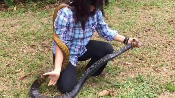 امرأة شجاعة تنقضّ على أفعى ضخمة وتسيطر عليه...شاهد الفيديو