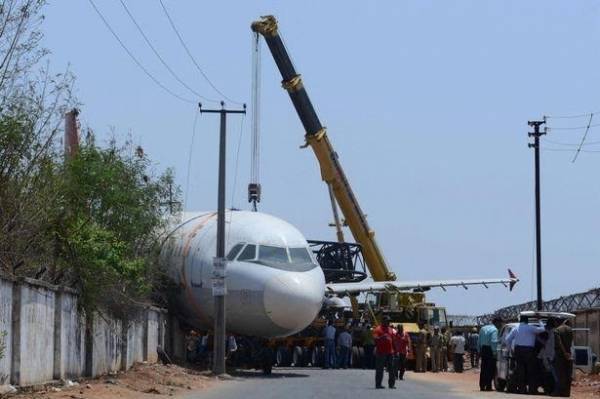 رفع طائرة الإيرباص الهندية التي سقطت فوق جدار برافعة عملاقة (صورة)