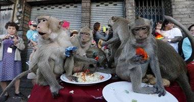القرود تتعدى على طعام الحضور بمهرجان تايلاندى