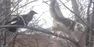 غراب يهاجم قط تسلق إلى شجرة .. فيديو
