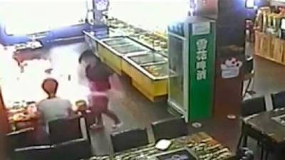 شاهد بالفيديو لحظة اشتعال النار بزبونه في احد المطاعم