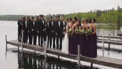 بالفيديو.. العروسان والمدعوون يسقطون في المياه