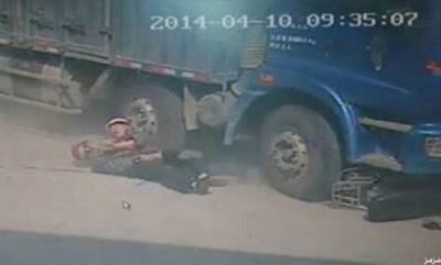 صور: صيني يضحي بحياته تحت عجلات شاحنة إنقاذاً لابنه