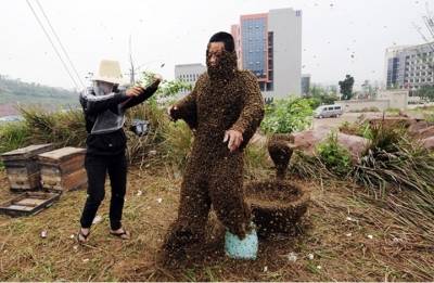 صيني يغطي جسمه بـ460 ألف نحلة للترويج لعسله