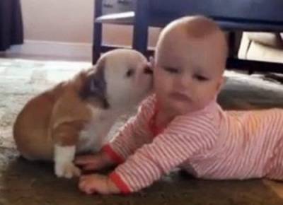 بالفيديو.. جرو يغرق طفلة رضيعة بالقبلات