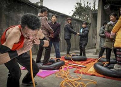 صيني ينفخ إطارات السيارات الأربعة بأنفه في 21 دقيقة