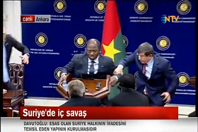 بالفيديو .. وزير خارجية بوركينا فاسو يفقد وعيه أثناء مؤتمر صحفي وأغلو يهب لنجدته