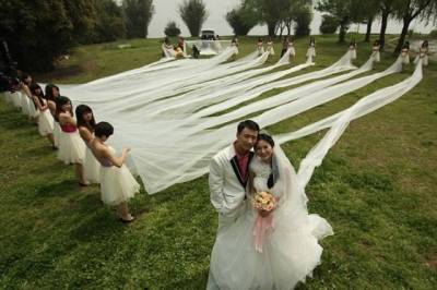 20 فتاة لحمل فستان زفاف طوله 520 مترا ."بالصور"