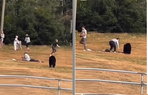 دب ضخم يقترب من زوجين وهروب في اللحظة الاخيرة (فيديو)