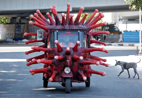 سائق توك توك هندى يغلف حافلته برسومات على شكل كورونا للتحذير من الفيروس