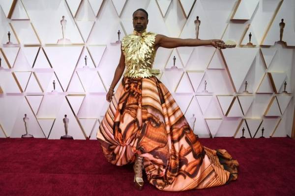 شاهد.. ممثل أمريكي يثير الجدل بفستان نسائي مذهب في حفل الأوسكار