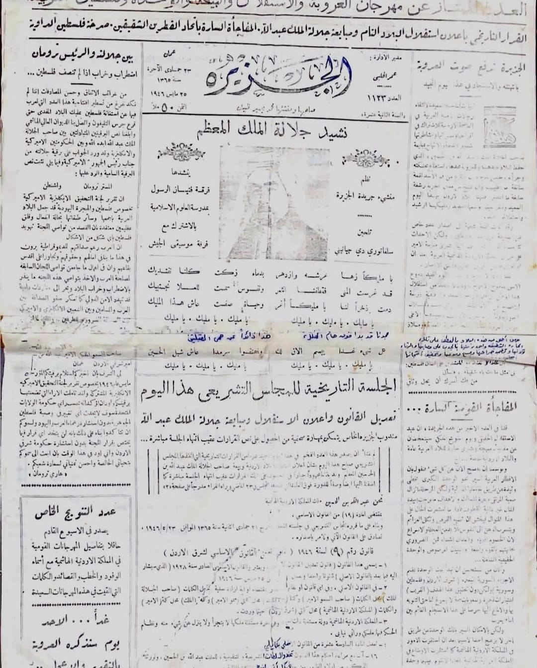 صحيفة الجزيرة الاردنية ماذا قالت عن ذكرى الاستقلال مقال لصاحبها المرحوم تيسير ظبيان يوم 25/5/1946