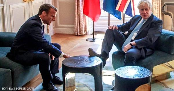 رئيس وزراء بريطانيا يضع قدمه على طاولة القهوة أمام رئيس فرنسا خلال لقائهما في قصرالإليزيه رد فعل ماكرون ..(فيديو)