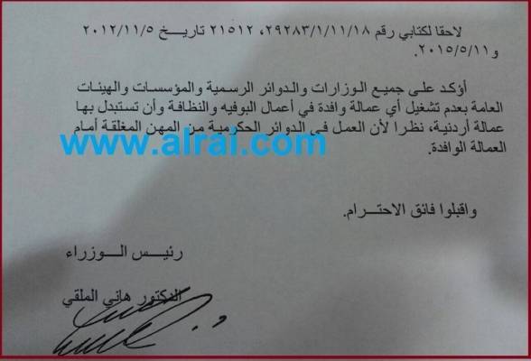 الملقي يعمم عدم تشغيل الوافدين في البوفيه والنظافة