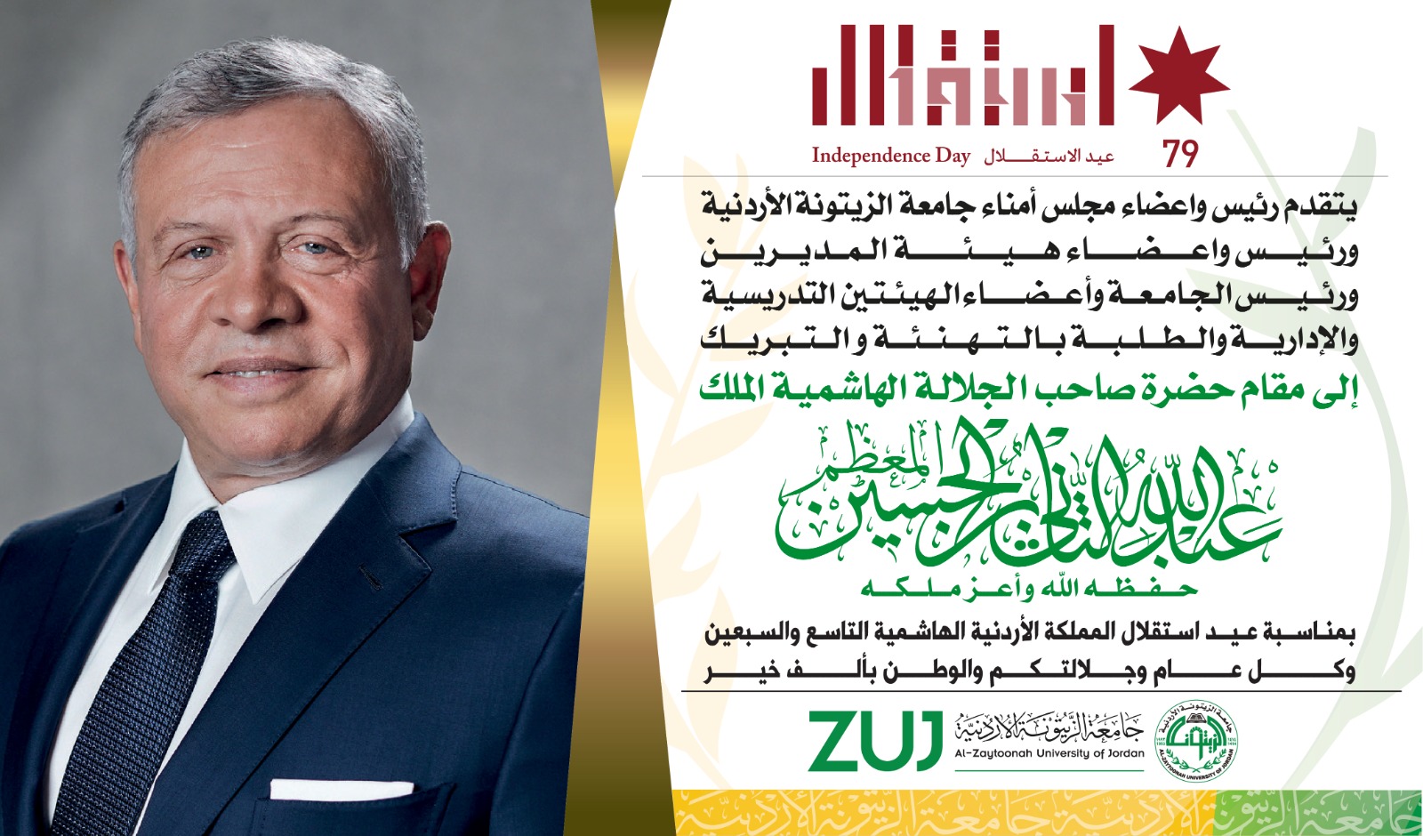 جامعة الزيتونة الأردنية ترفع أسمى آيات التهنئة لجلالة الملك بمناسبة عيد الاستقلال التاسع والسبعين