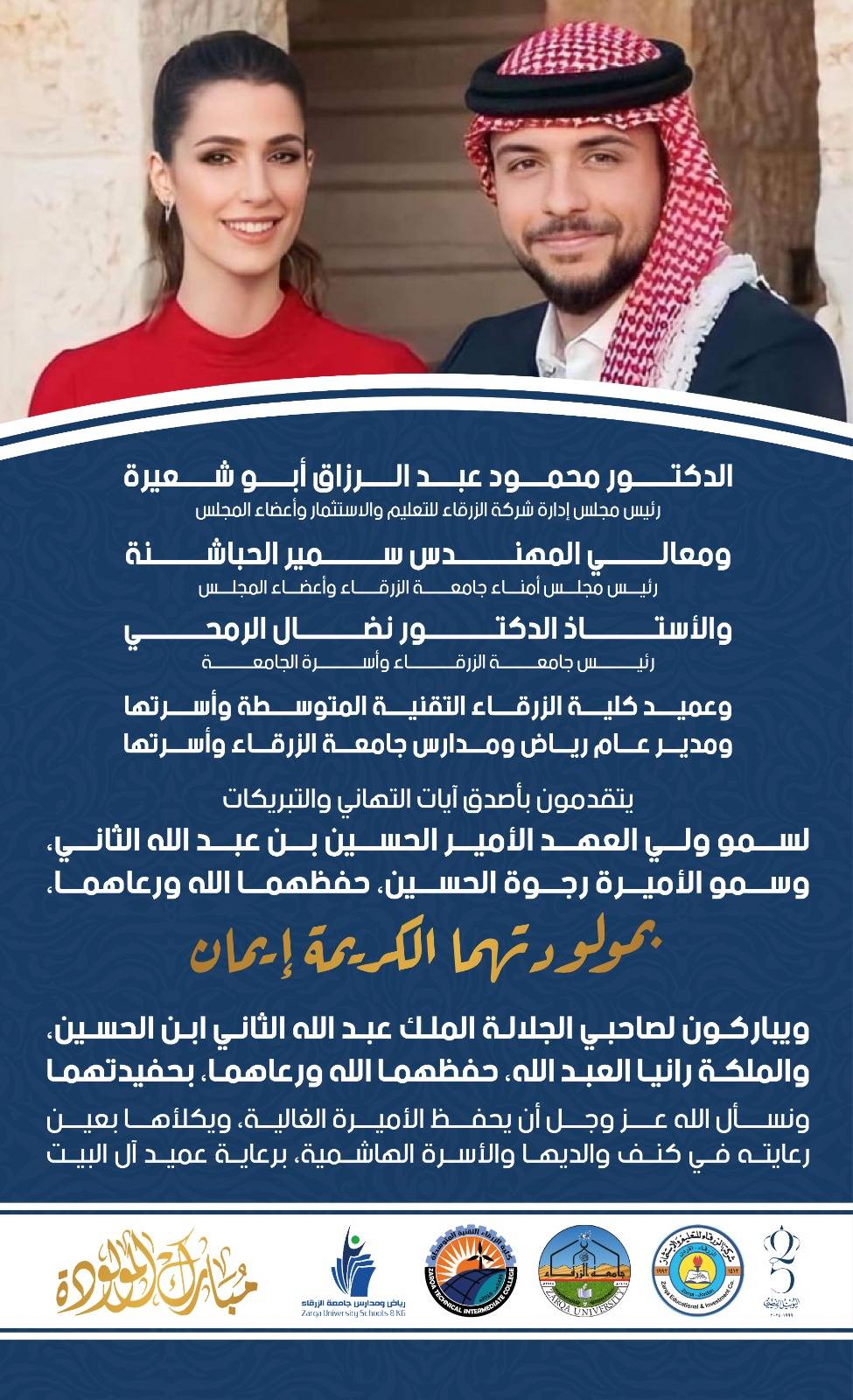 جامعة الزرقاء تهنىء سمو ولي العهد والأميرة رجوة بقدوم المولودة إيمان
