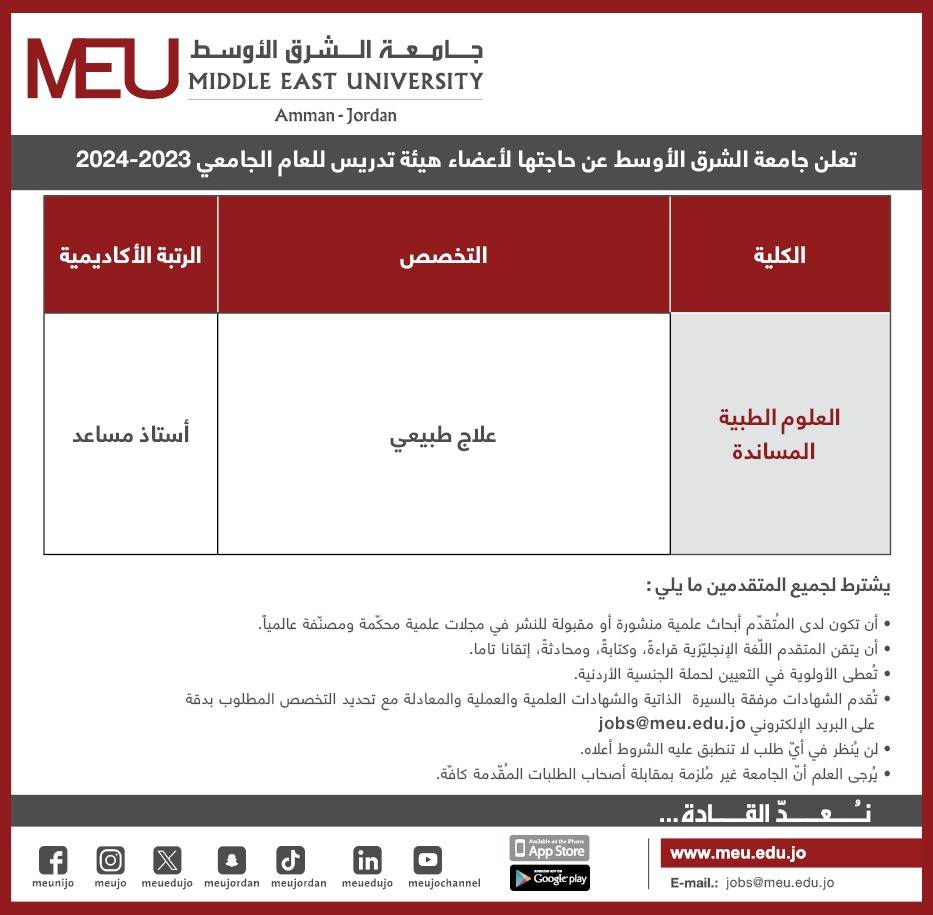 تعلن جامعة الشرق الأوسط عن حاجتها للشاغر الأكاديمي التالي وفقًا للشروط والمتطلبات المذكورة
